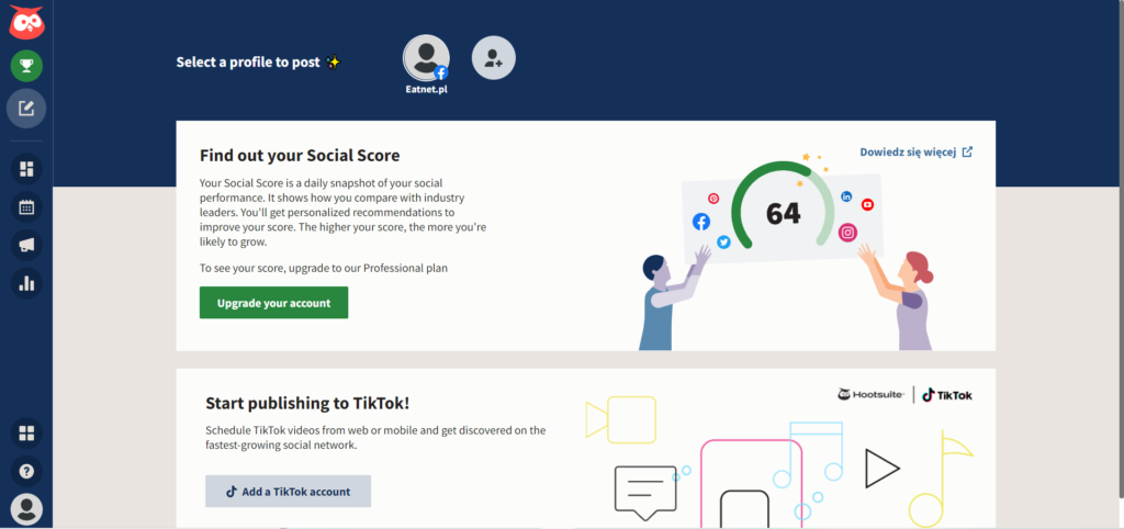 Hootsuite jest jednym z najpopularniejszych narzędzi zarządzających siecia społecznościowych. Po rejestracji możemy podłączyć do swojego profilu konta z Twittera, Facebooka, strony Google+, LinkedIn, Foursquare, WordPress.com oraz MySpace. To co mi się bardzo podoba, to możliwość podpięcia zarówno profilu prywatnego na Facebooku, jak również stron i grup. Dzięki temu bardzo szybko można powiadomić wieloma kanałami np. o nowym wpisie na blogu, akcji promocyjnej, czy wprowadzanym nowym produkcie lub usłudze.